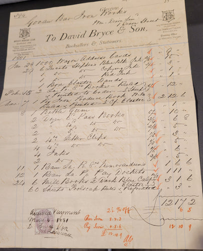Two Invoice Statements circa 1881 from the David Bryce Business to Govan Bar Iron Works and Messer's William Dixon & Co.