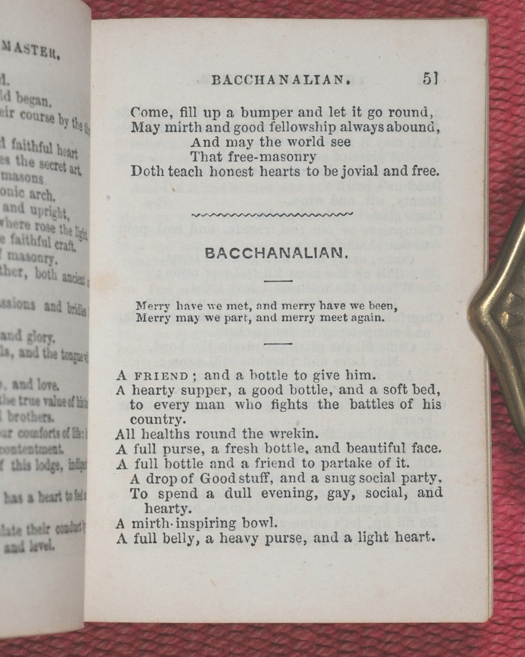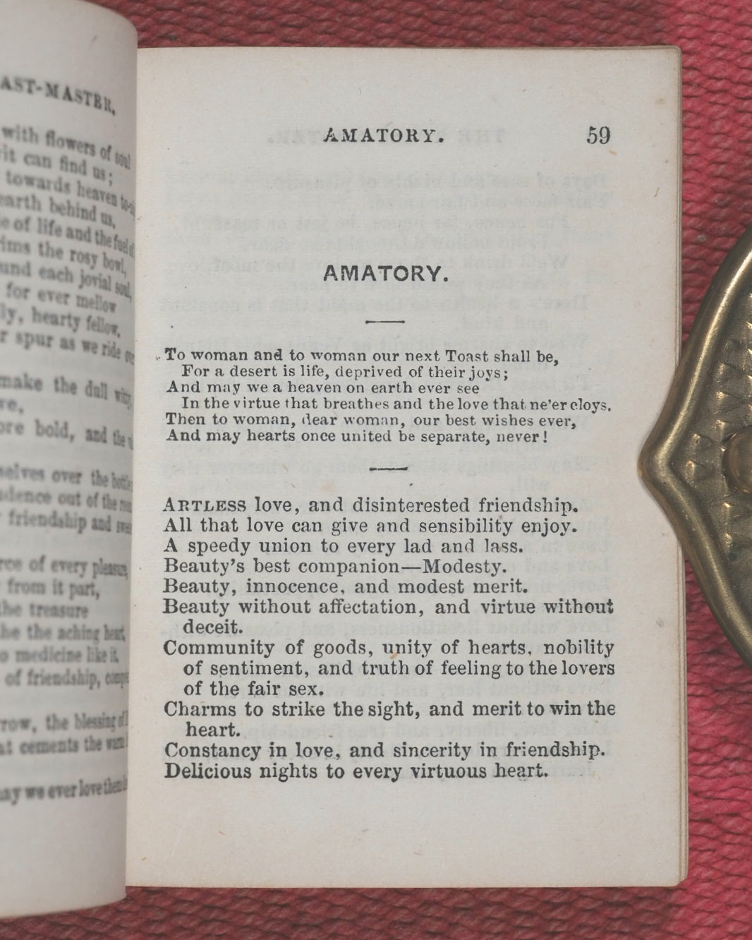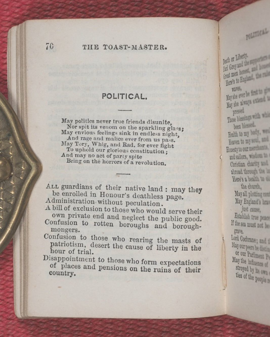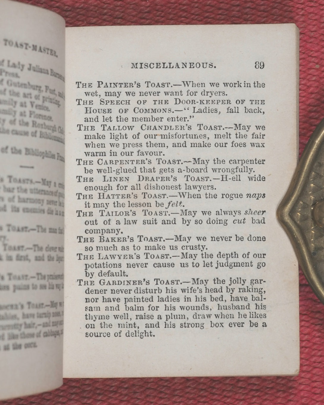 The chapters include: Loyal and Patriotic, Naval and Military, Masonic, Bacchanalian, Amatory, Sporting, Political, Sentimental, Flash (a "flash-house" in the Victorian era was a public house or inn that served as a center for criminal activity, often combining a pub with a brothel or other illicit services), and an extensive Miscellaneous section (such as toasts for Bibliomaniacs, Musicians, Surgeons, Waiters, Glaziers, Greengrocers, Painters, Carpenters, Drapers, Hatters, Tailors, Bakers, Lawyers, Gardeners,, Teachers, and so on).