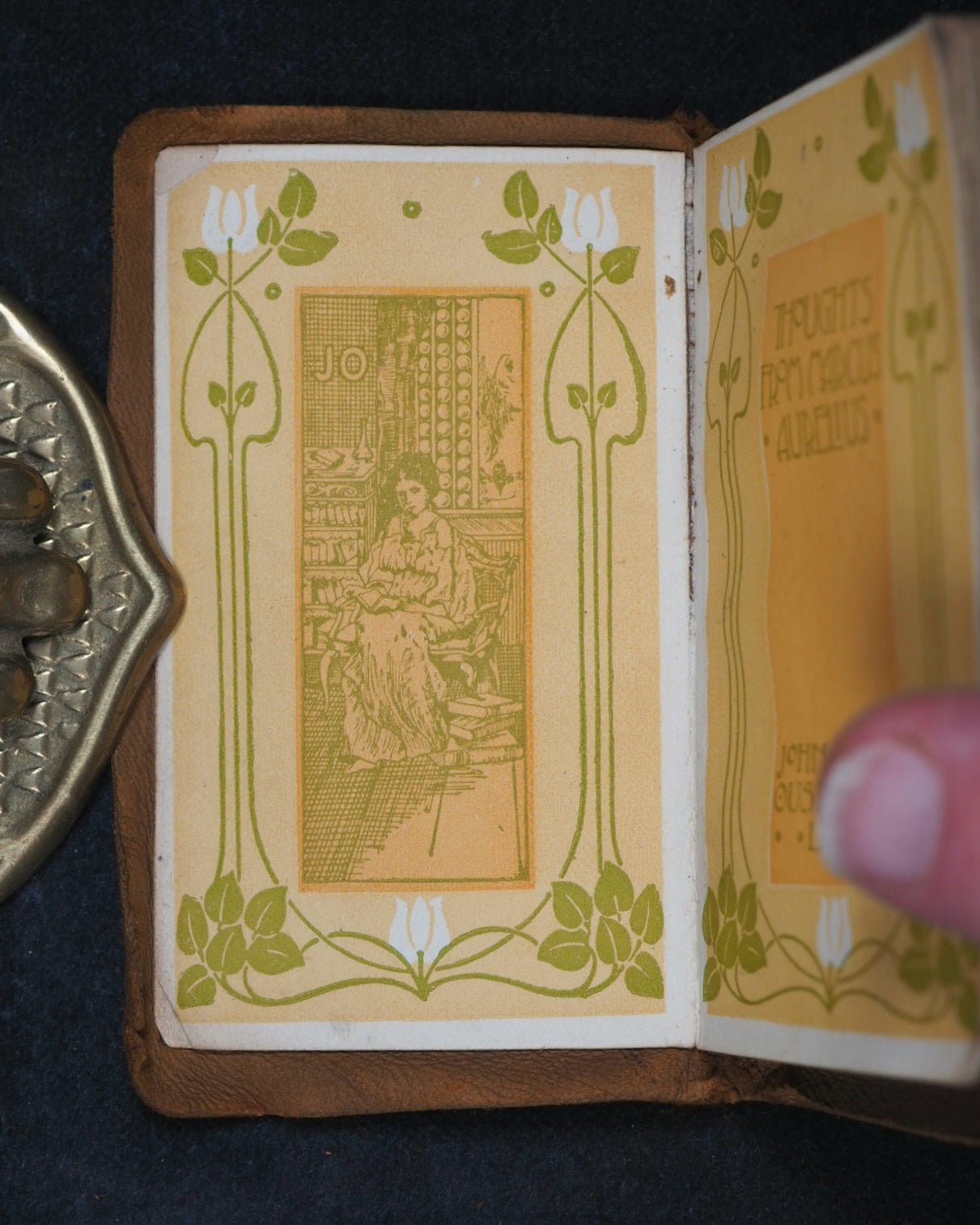 127 pages. Title and frontispiece pages in yellow and green and art nouveau style. Printed by Riverside Press, Edinburgh. All edges gilt. Original marbled endpapers. 50 x 90 mm. Publisher's brown reverse calf yapp-style binding with embossed art nouveau decoration on upper cover. Slight wear to top of spine and some edges. Not in Bondy, nor Spielmann, nor Welsh. WorldCat locates no copies of this edition worldwide.