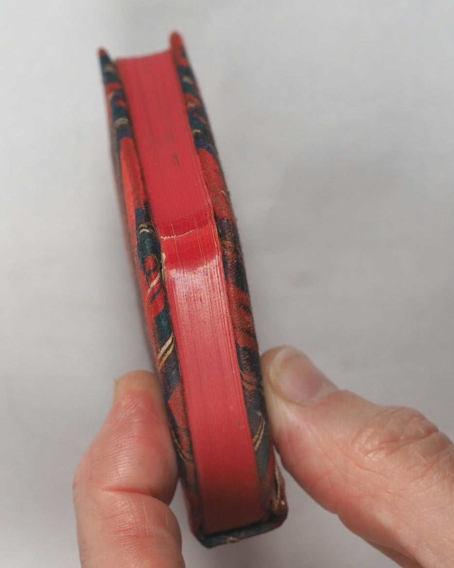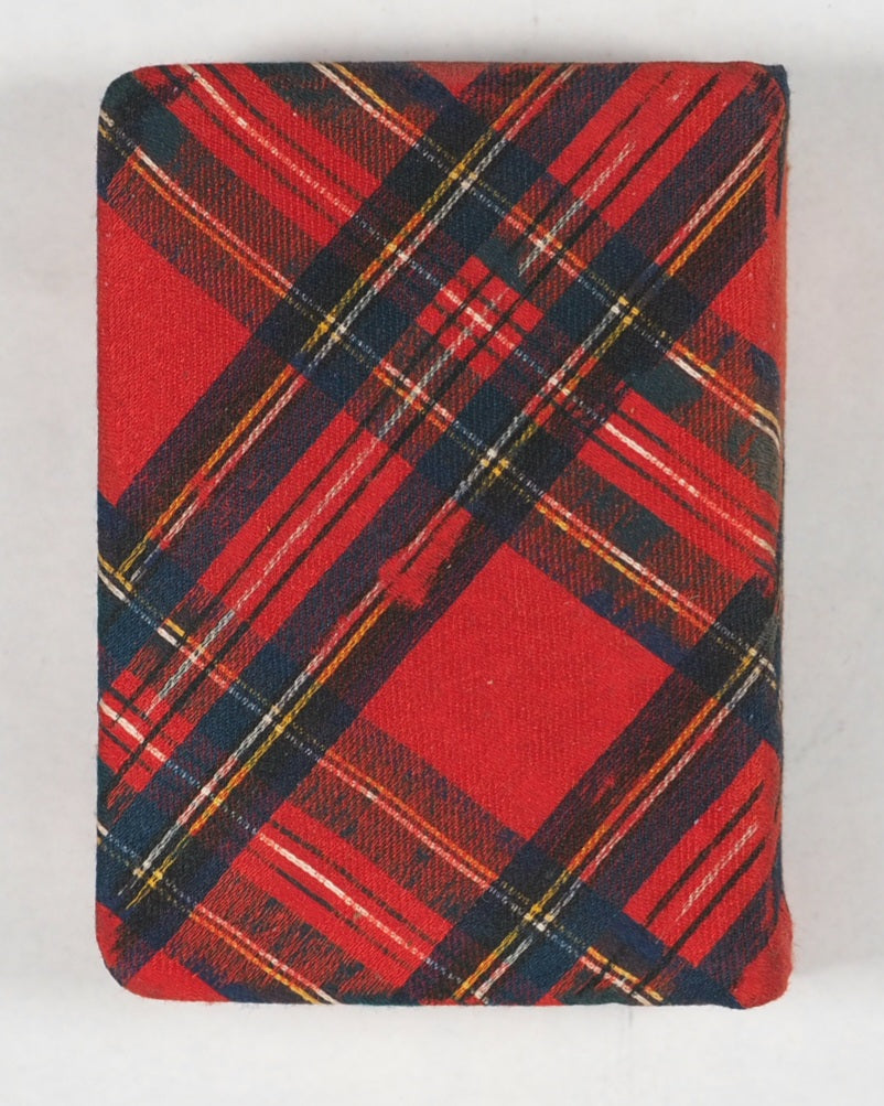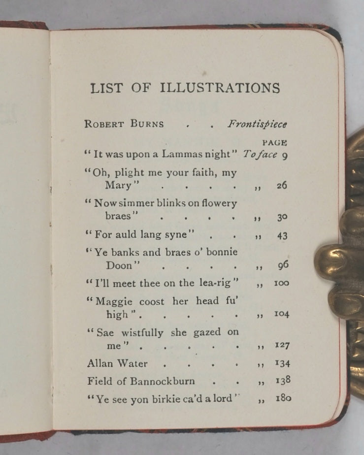 240 printed pages. Portrait frontispiece.11 black & white plates. Thistle Library. Rounded corners. All edges red. Original marbled endpapers. No inscriptions. Complete with index and glossary. 60 x 86 mm. Original tartan silk from the Royal Stewart clan with label on rear paste-down endpaper indicating it; tartan slightly worn in parts. Not in Bondy, nor Spielmann, nor Welsh. WorldCat locates no copies worldwide. Similar to Bryce edition from 1890s (Golden Thoughts & Tartan series, 23. Welsh, 1530). Originally sold as a tourist memento, it is now mostly wanted by those who remember the annual Burns night celebrations.