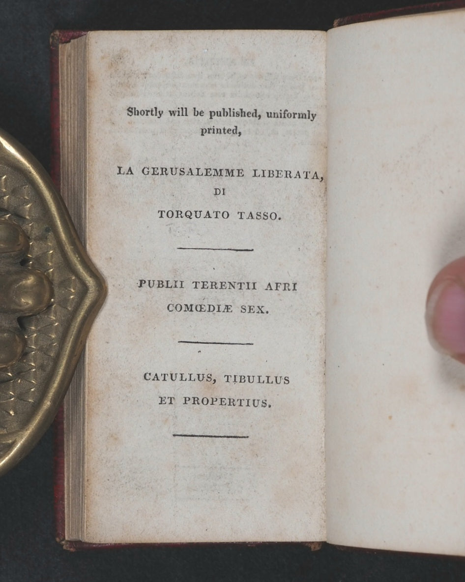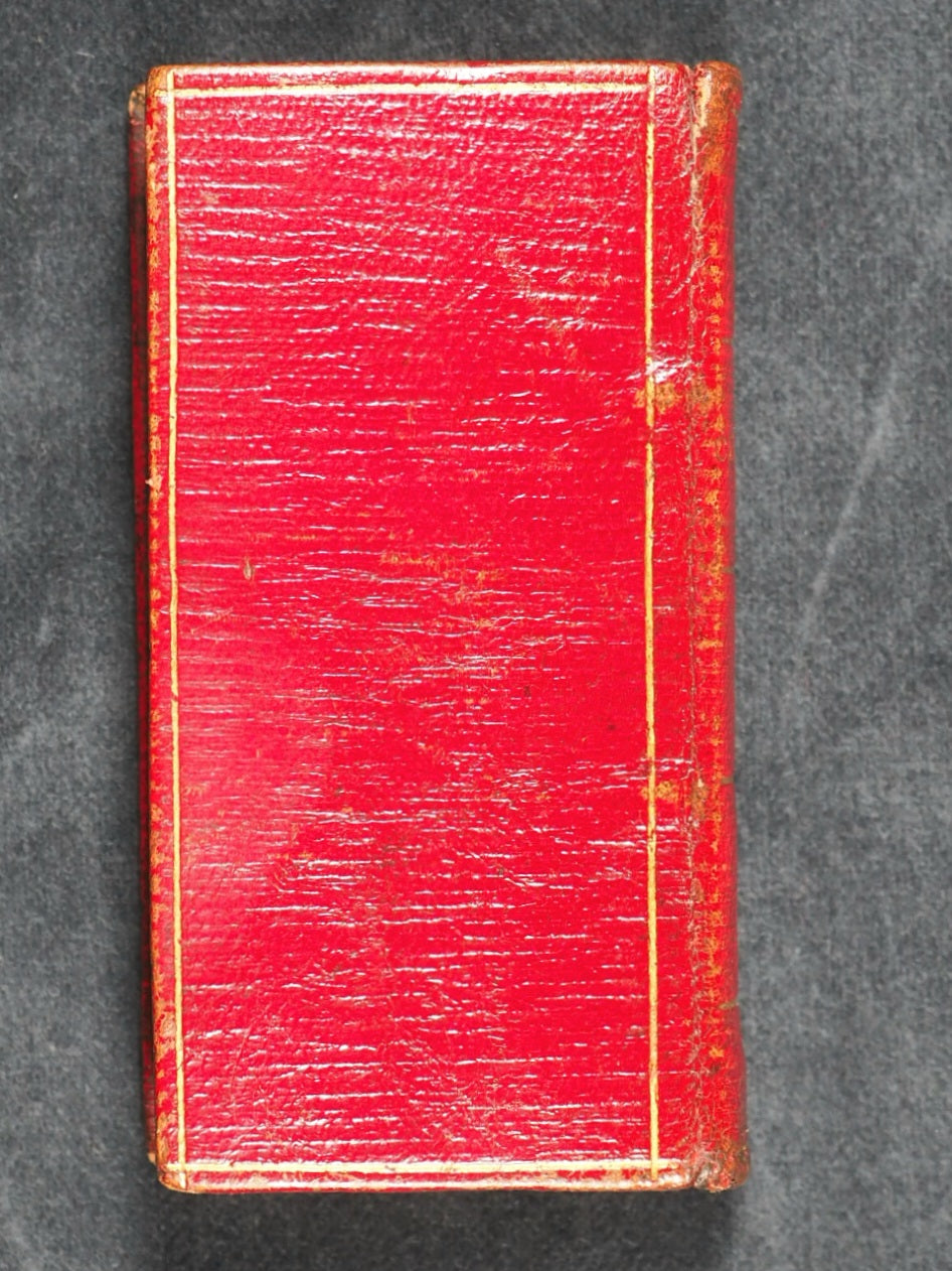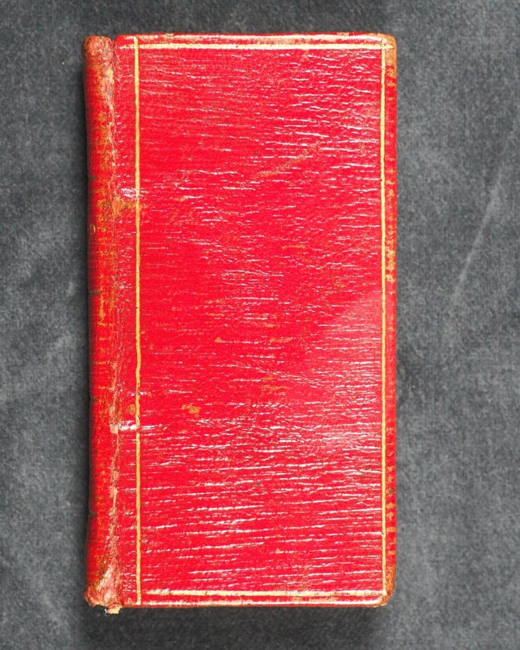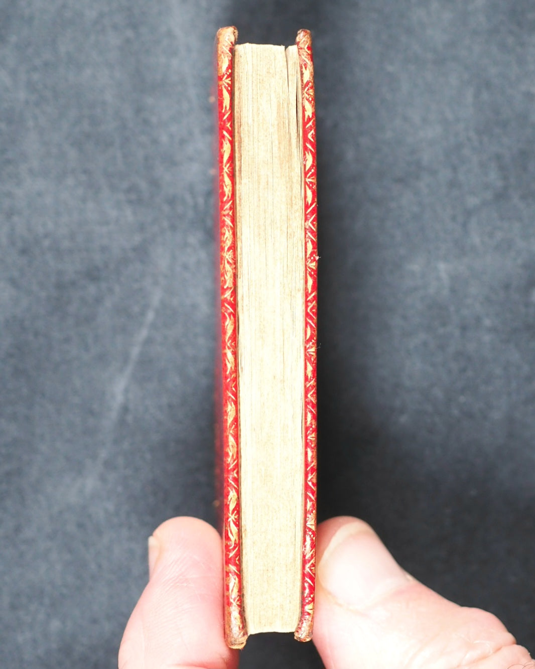 One of the early, finely printed Pickering's Diamond Classics. Printed by Corrall in diamond (4 1/4 point) type, about 18 lines to an inch, renowned for its legibility and the quality of the printing. Original cream endpapers. Other titles in the Diamond Classics Series were printed by other printers for Pickering, and not all were printed with diamond type. 42 x 84 mm. Contemporary tawny red, straight-grained morocco. Hinges slightly cracked, but firm. Slightly rubbed at edges, and at head and tail of spine. Bondy, 86. Nauroy, 35. Spielmann, 93. Welsh, 1897. OCLC, 35171830. WorldCat locates 32 copies worldwide.