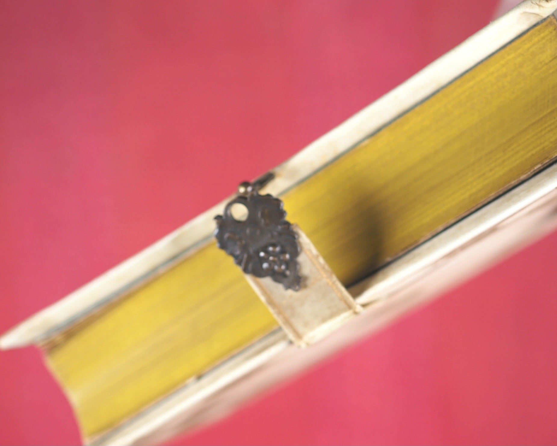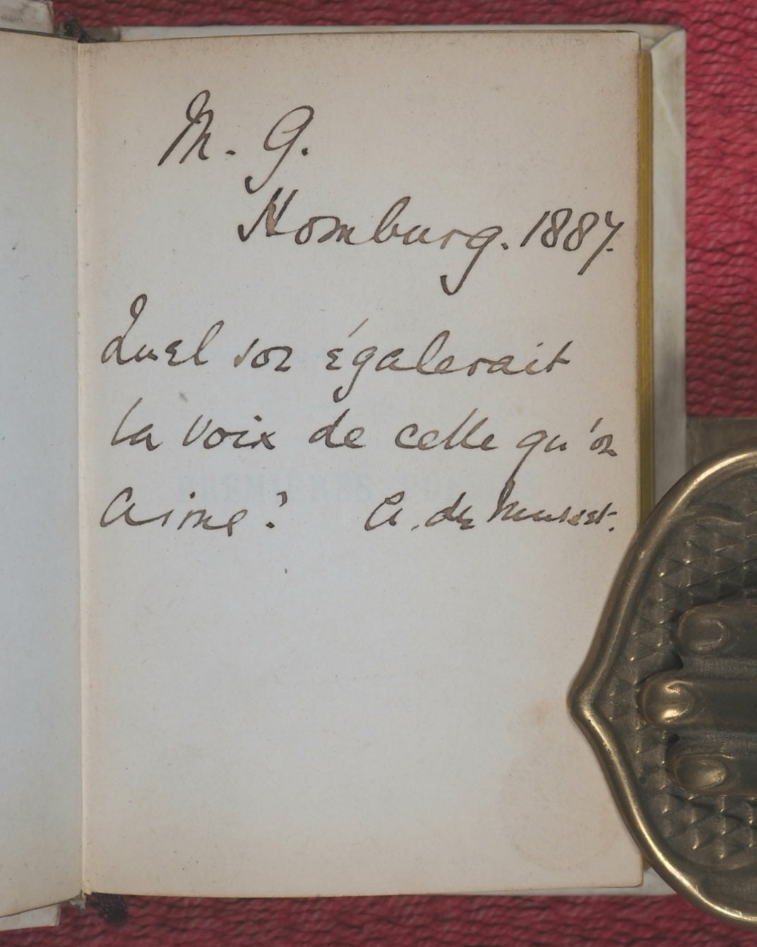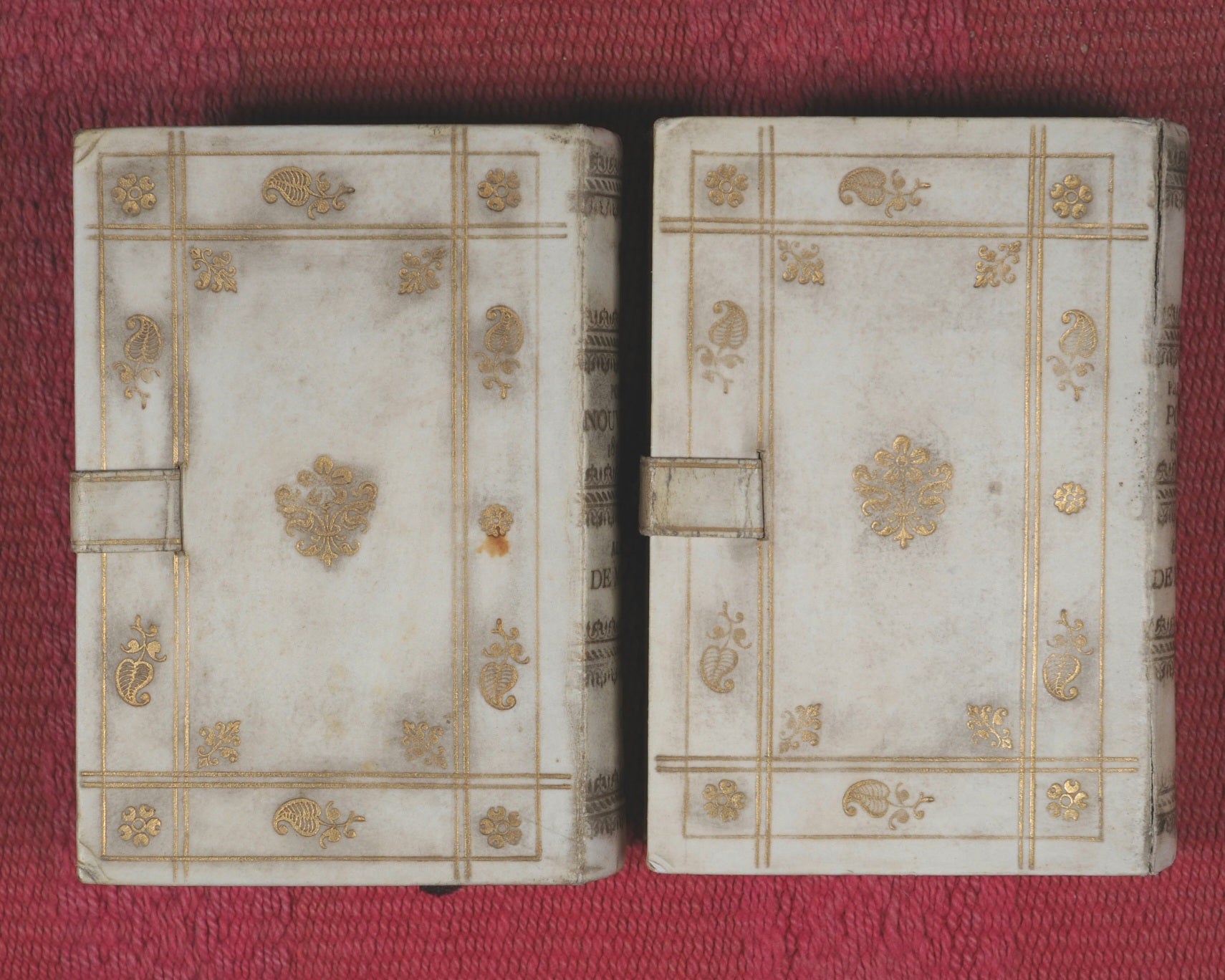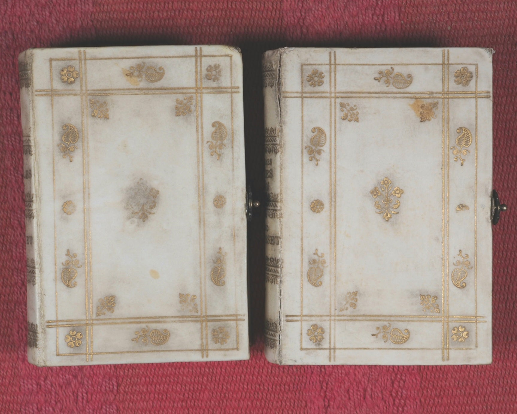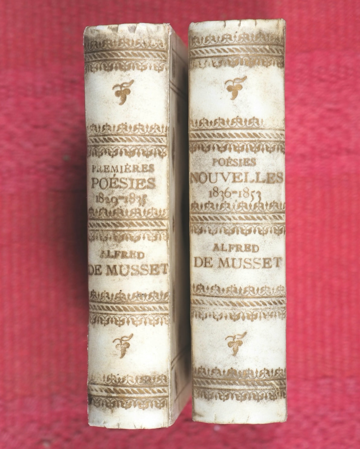 394 , and 324 pages in French. Printed by E. Capiomont et V. Renault, rue des Portevins, 6 and by C. Marpon et E. Flammarion, 26 Rue Racine [Paris], respectively. Each with portrait frontispieces by David D'Angers and by Léopold Flameng. Each with an etching after Bida - all plates with original tissue guards. Both volumes in the series 'Petite Bibliothèque-Charpentier'. Original duck-blue endpapers. All edges yellow. Both volumes with contemporary owner's initials in ink on blank preliminary leaves, dated 1887. Provenance: M.G. Homburg. The first volume also has a quote from the author, " Quel Son égalerait la voix de celle qu'on aime?". Both have contemporary bookseller's round grey and white printed labels for N. Goldschmidt-Tissot, Berlin (a firm of metalworking, jewelers, and luxury goods retailer, located at 58 Unter den Linden in Berlin, that was an official supplier to the royal court in Prussia). Both volumes have the original plum silk page-saving ribbons. 80 x 113 mm. Uniformly and contemporaneously bound in full bevelled vellum with Derôme style decorative floral decoration in gilt within panel mitred borders, and scrolling horizontal rolls on the spines. Complete with original vellum straps with ornamental brass clasps. Upper cover of second volume slightly rubbed. Hinges of first volume with partial splits along the outer hinges.