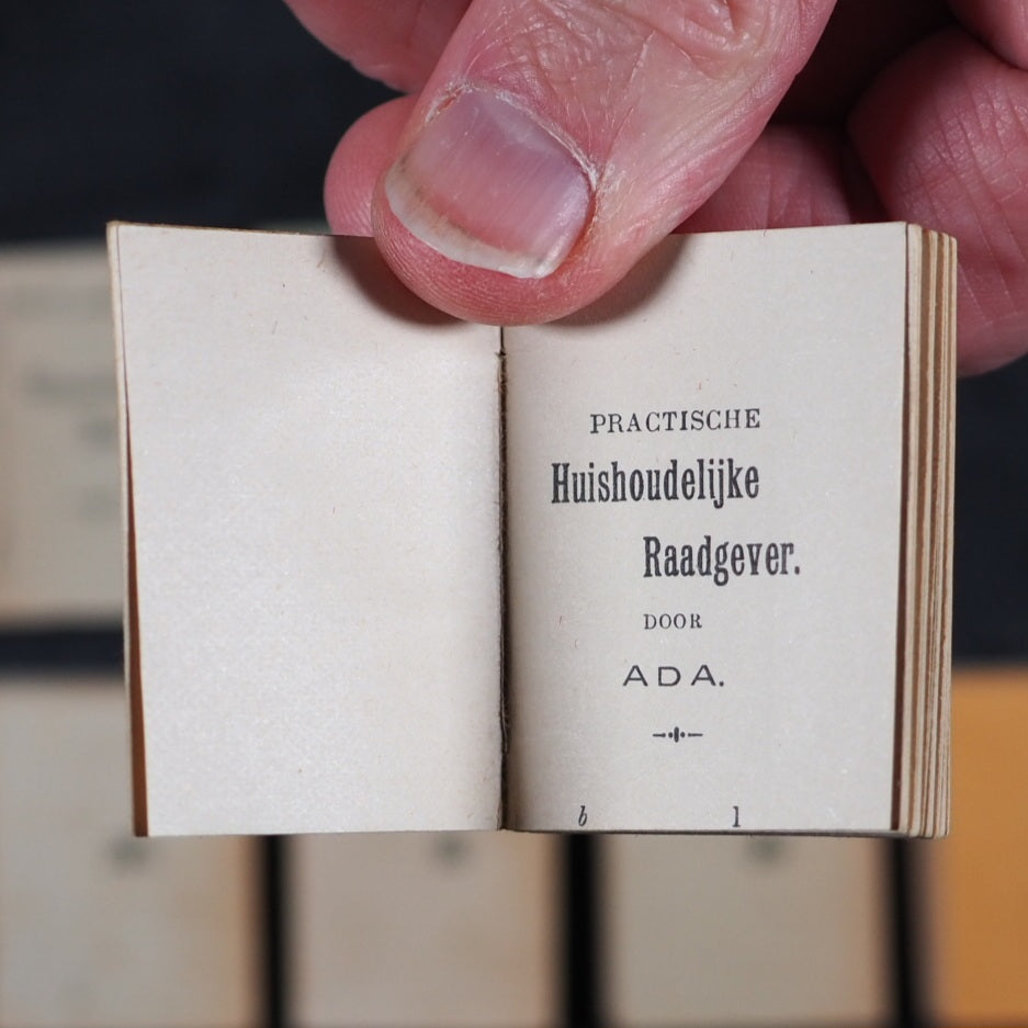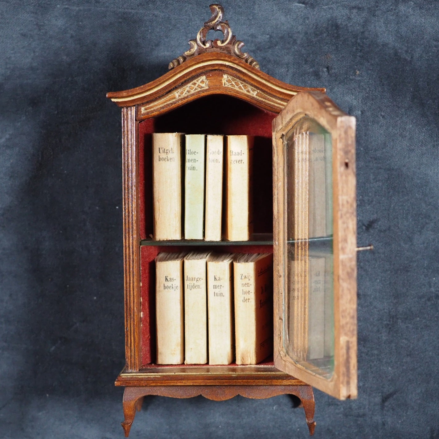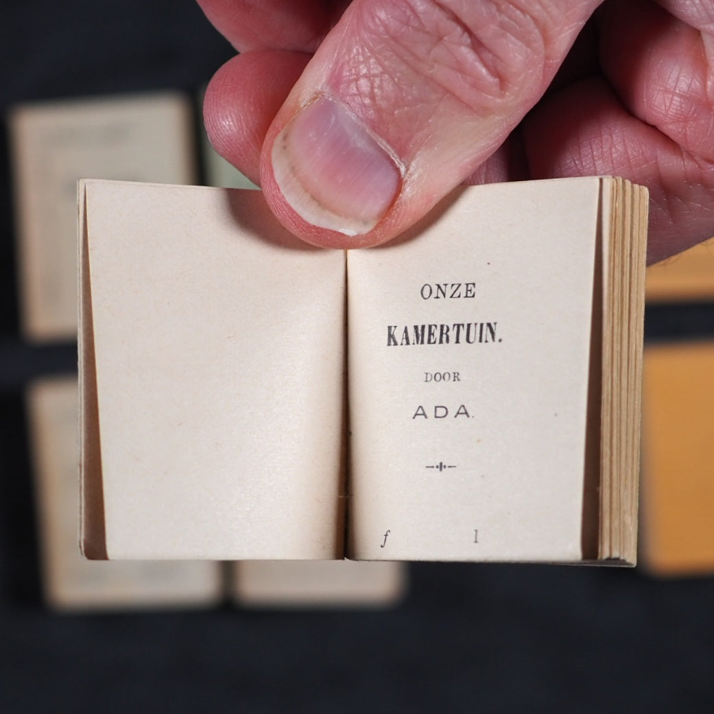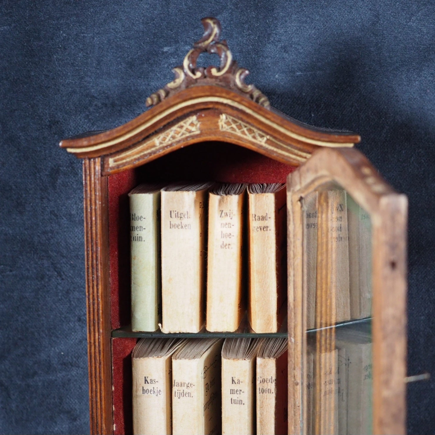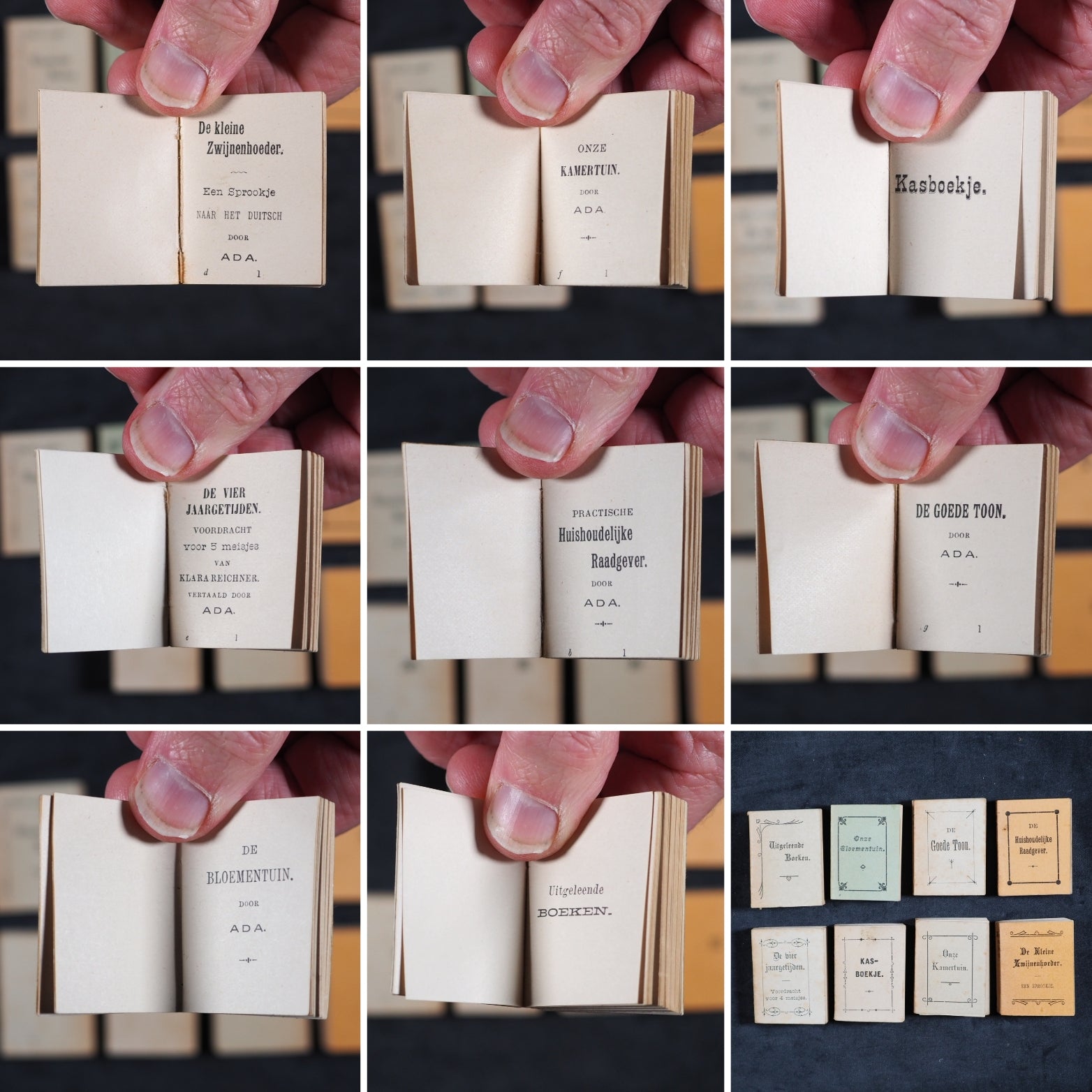 Ada [author]. Miniatuurbibliotheek voor jonge meisjes. No publisher. No place. 1896. Eight (out of ten) Dutch books in their original walnut miniature bookcase, with hinged, bevelled glass door, metal handle and glass central shelf. 1/ Onze Kamertuin [Room Garden], by Ada, 76 printed pages. OCLC 65793033. 2/ De Goede Toon [Good Show], by Ada, 46 pages. OCLC 65793023. 3/ De Bloementuin [Flower garden], by Ada, 60 pages. OCLC 65793034. 4/ Uitgeleleende Boeken [Borrowed books], unpaginated. OCLC 65793007. 5/ De Kleine Zwijnehhedr (Little Swineherd), by Ada, 64 pages. OCLC 65793017. 6/ De Vier Jaargetijden [Four Seasons. Lectures for four girls], by Ada, 62 pages. OCLC 65793012. 7/ Kas Boekje [Cashbook], unpaginated. OCLC 65793002. 8/ Practische Huishoulelijke [Household Counsellor], by Ada, 61 pages. OCLC 65793027. Missing from this collection are Albumversjes en Gedachten voor poeziealbum,OCLC 65793019, and Kookboek, OCLC 69166501. According to Pistner the German version was published in 1896 and by G. Weise in Stuttgart. Pistner also has only eight of the ten German volumes.The German version was known as Miniatur-Bibliothek fur junge Madchen. The publishing house was founded by Gustav Weise, the former co-owner of Julius Weise's court bookstore, in Stuttgart in 1863. John Marshall had published German and French translations of his 'Infant's Library' in London in 1800, and similarly, Gustav Weise probably published his original 1896 Miniatur-Bibliothek fur junge Madchen in Dutch in the same year. In 1921, A. Tuneewa referred to a copy of the German version held in the Odessa State Library, that she attributed to the writer Klara Reichner, a nom de plume for German author Klara Jochner (1843-1913). The number of pages differs in the German version. Doris Welsh subsequently refers to the Odessa copy in her reference book (reference numbers 3835, 5959, 5960, 5961, 5962, 5963, 6498, . 34 x 45 mm. Bookcase 78 x 155 x 62 mm. Original harlequin card covers with titles in various differing typefaces within printer's decorative borders on the front covers; small decorative devices on the back covers. Some very mild fading. Not in Bondy, nor Spielmann nor Welsh. Pistner, 235 for German version. OCLC, 65793033. WorldCat locates one sole copy worldwide (Amsterdam University). Very rare miniature library. 21 firsts2024