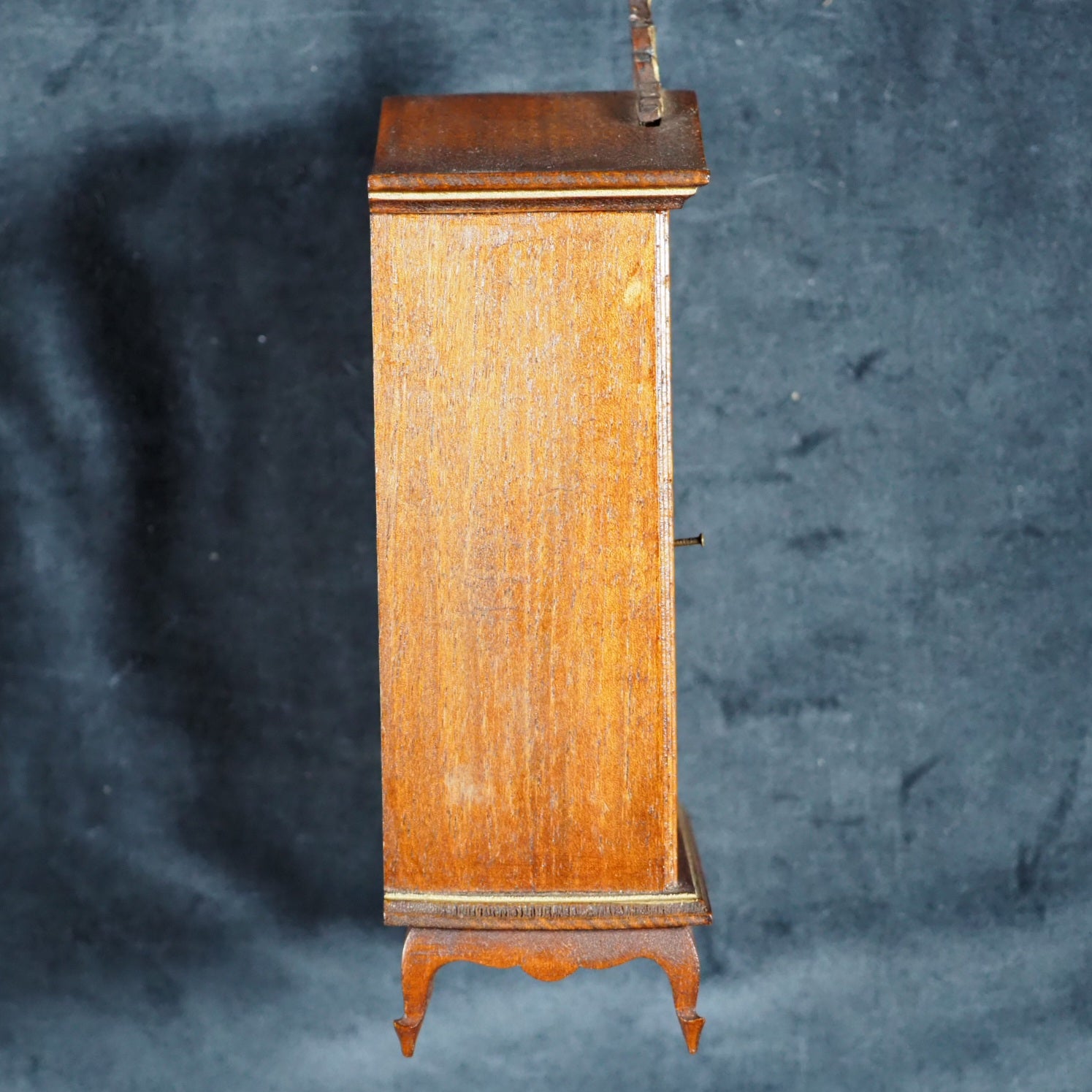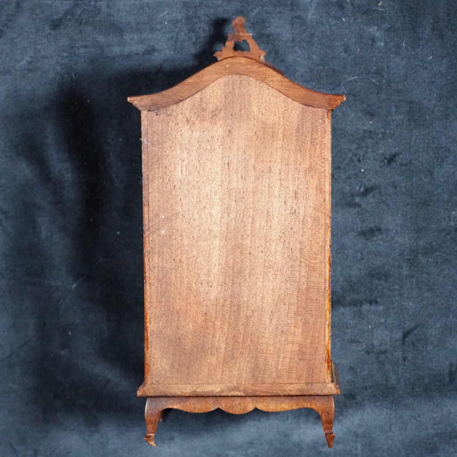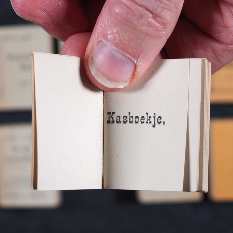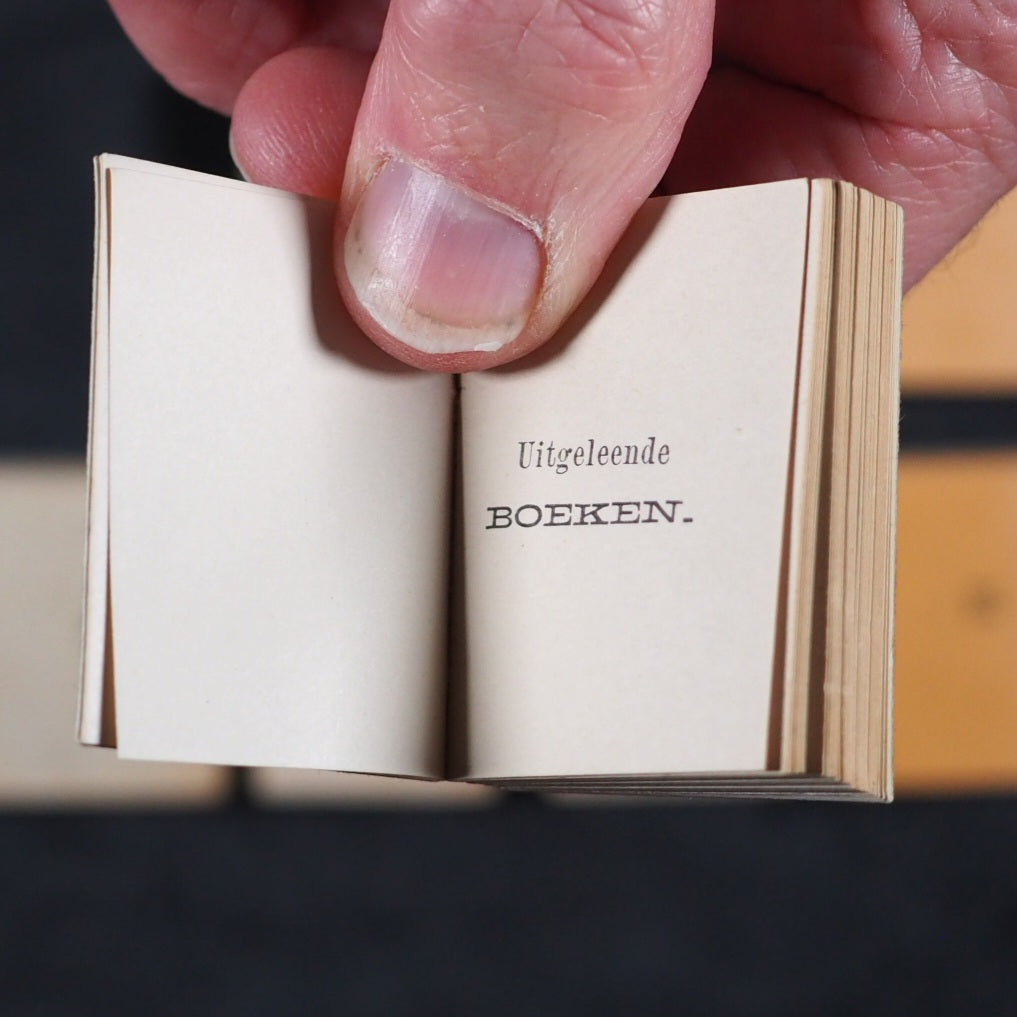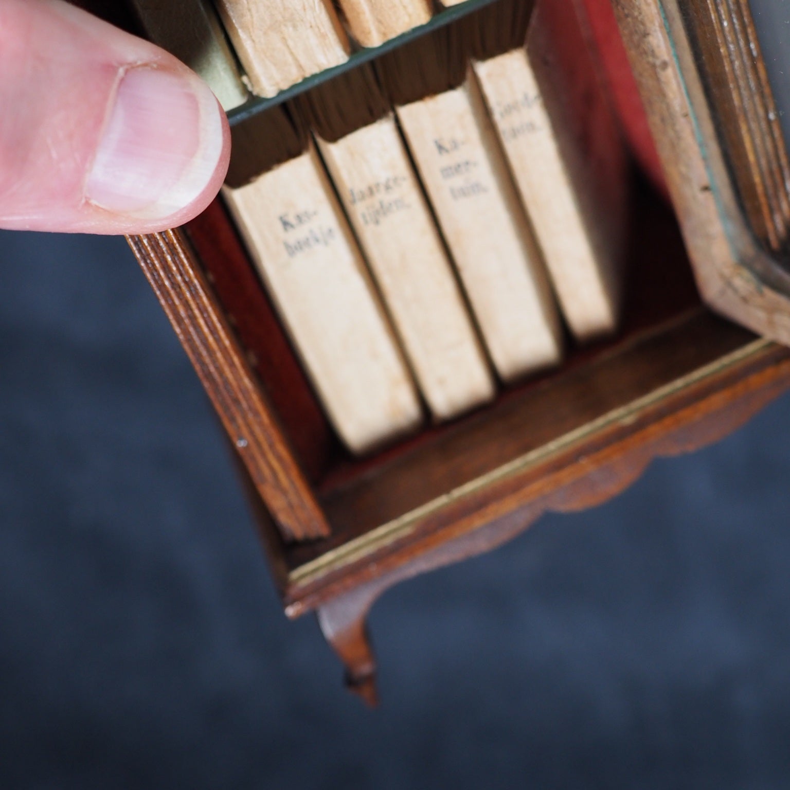 Ada [author]. Miniatuurbibliotheek voor jonge meisjes. No publisher. No place. 1896. Eight (out of ten) Dutch books in their original walnut miniature bookcase, with hinged, bevelled glass door, metal handle and glass central shelf. 1/ Onze Kamertuin [Room Garden], by Ada, 76 printed pages. OCLC 65793033. 2/ De Goede Toon [Good Show], by Ada, 46 pages. OCLC 65793023. 3/ De Bloementuin [Flower garden], by Ada, 60 pages. OCLC 65793034. 4/ Uitgeleleende Boeken [Borrowed books], unpaginated. OCLC 65793007. 5/ De Kleine Zwijnehhedr (Little Swineherd), by Ada, 64 pages. OCLC 65793017. 6/ De Vier Jaargetijden [Four Seasons. Lectures for four girls], by Ada, 62 pages. OCLC 65793012. 7/ Kas Boekje [Cashbook], unpaginated. OCLC 65793002. 8/ Practische Huishoulelijke [Household Counsellor], by Ada, 61 pages. OCLC 65793027. Missing from this collection are Albumversjes en Gedachten voor poeziealbum,OCLC 65793019, and Kookboek, OCLC 69166501. According to Pistner the German version was published in 1896 and by G. Weise in Stuttgart. Pistner also has only eight of the ten German volumes.The German version was known as Miniatur-Bibliothek fur junge Madchen. The publishing house was founded by Gustav Weise, the former co-owner of Julius Weise's court bookstore, in Stuttgart in 1863. John Marshall had published German and French translations of his 'Infant's Library' in London in 1800, and similarly, Gustav Weise probably published his original 1896 Miniatur-Bibliothek fur junge Madchen in Dutch in the same year. In 1921, A. Tuneewa referred to a copy of the German version held in the Odessa State Library, that she attributed to the writer Klara Reichner, a nom de plume for German author Klara Jochner (1843-1913). The number of pages differs in the German version. Doris Welsh subsequently refers to the Odessa copy in her reference book (reference numbers 3835, 5959, 5960, 5961, 5962, 5963, 6498, . 34 x 45 mm. Bookcase 78 x 155 x 62 mm. Original harlequin card covers with titles in various differing typefaces within printer's decorative borders on the front covers; small decorative devices on the back covers. Some very mild fading. Not in Bondy, nor Spielmann nor Welsh. Pistner, 235 for German version. OCLC, 65793033. WorldCat locates one sole copy worldwide (Amsterdam University). Very rare miniature library. 21 firsts2024
