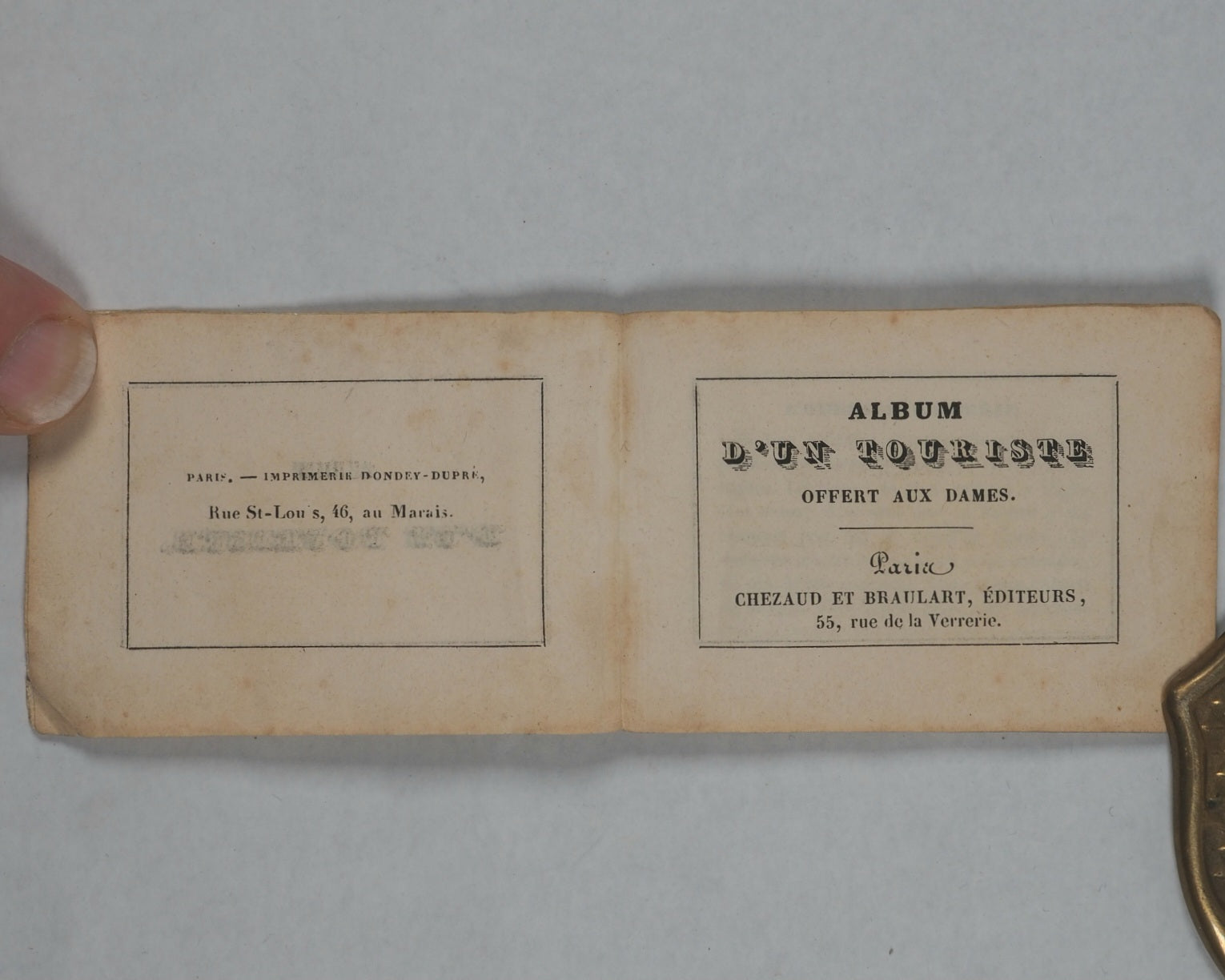 20 pages in French. 5 engravings, signed in the plate, Chezaud et Braulart, Paris. Printed by Dondey-Dupré, Rue St-Louis, 46, au Marais. No inscriptions. 66 x 46 mm. Original yellow glossy paper wrappers. Foot of spine slightly worn, covers slightly creased, edges with a few minuscule closed tears, and corners folded. Not in Bondy, nor Spielmann, nor Welsh. OCLC, 958830926. WorldCat records one sole copy worldwide at the Pierpont Morgan Library. The locations described and illustrated are romantic and imaginary idylls, such as the Immortal Bridge and the Lush Valley. The final page mentions seventeenth century painters Teniers and Paul Potter and their love of pastoral nature. This is a rare and beautifully illustrated miniature book in its original publisher's wrappers.