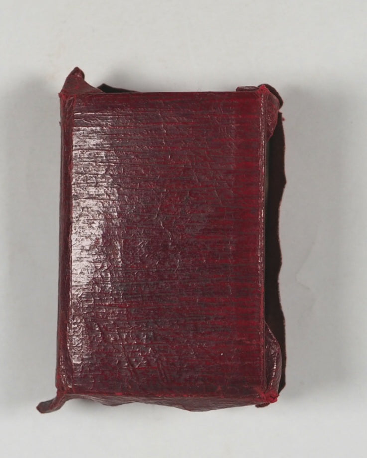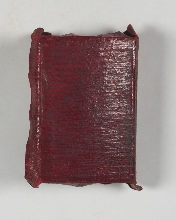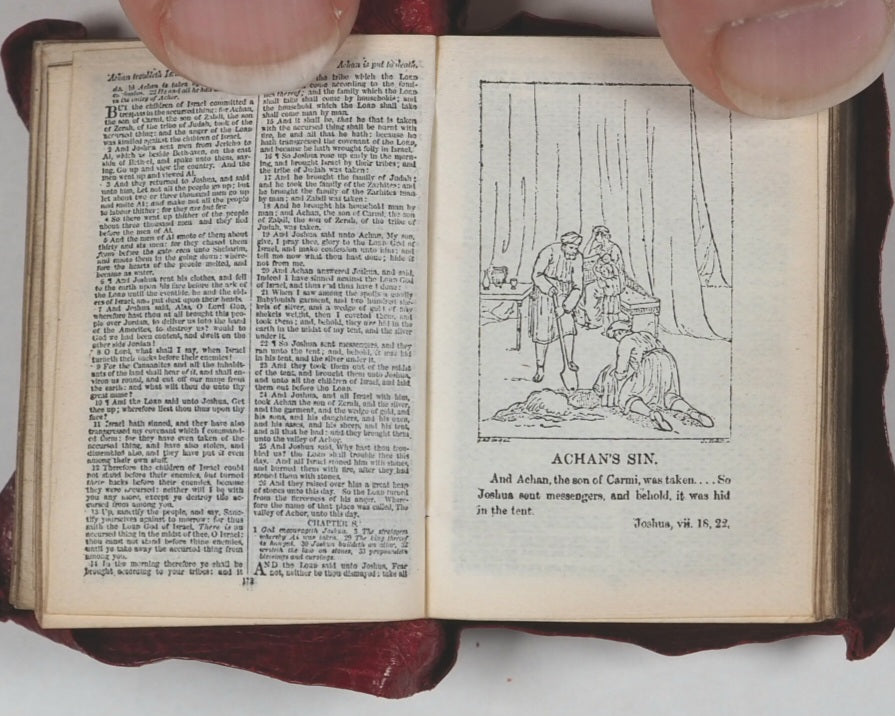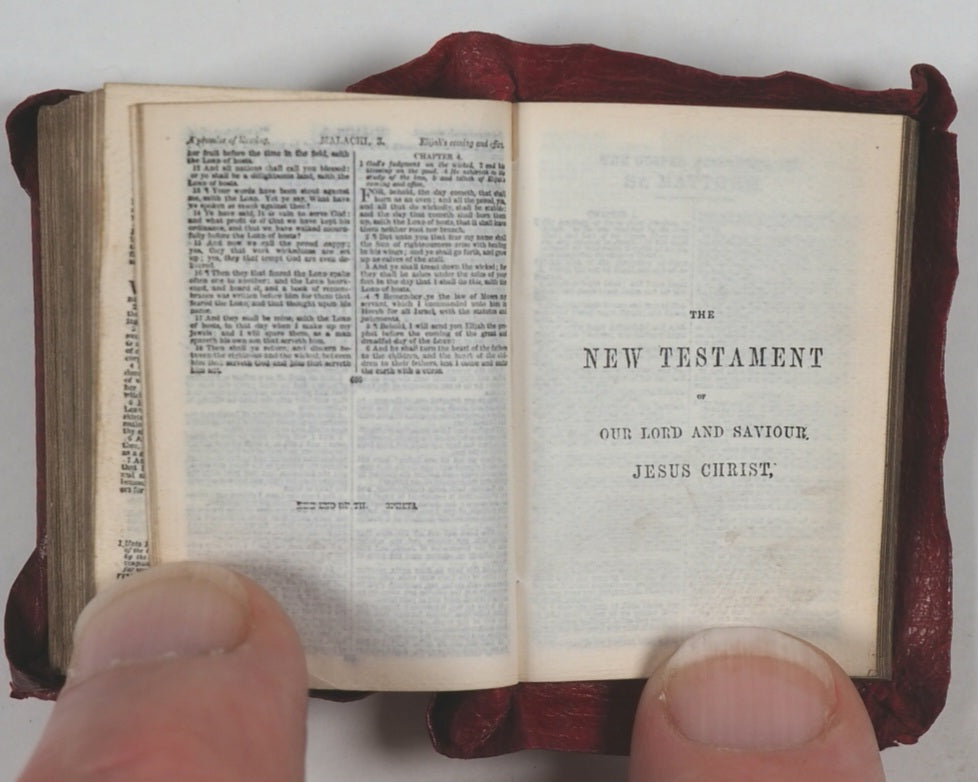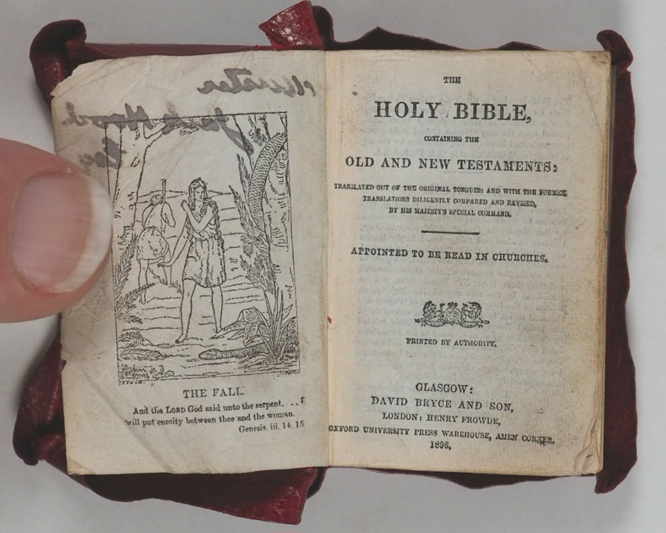 876 pages with 28 full-page illustrations. Printed by photo-reduction at the Glasgow University Press on the thinnest 'India' paper supplied by Henry Frowde of the Oxford University Press. First edition of what was then the smallest bible in the world. All edges gilt. Lacks front free endpaper. Original primrose endpapers. Contemporary ownership inscrption on recto of frontispiece. 30 x 42 mm. Original straight-grained red morocco yapp style binding with magnifying glass in front pocket. Light abrasions to the hinges. Bondy. 108. Garbett, 20. Spielmann, 25. Welsh, 562. A revolution in publishing for that era, given the number of pages and tiny size of the volume.